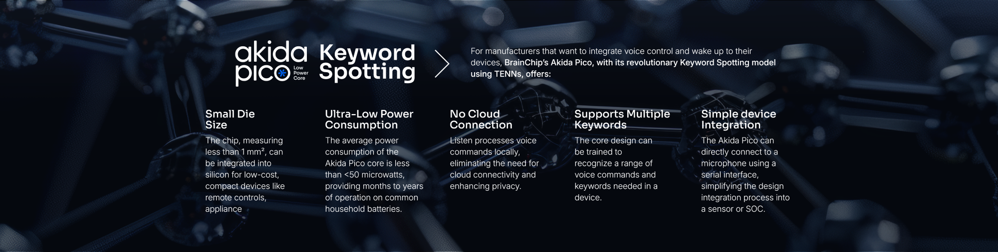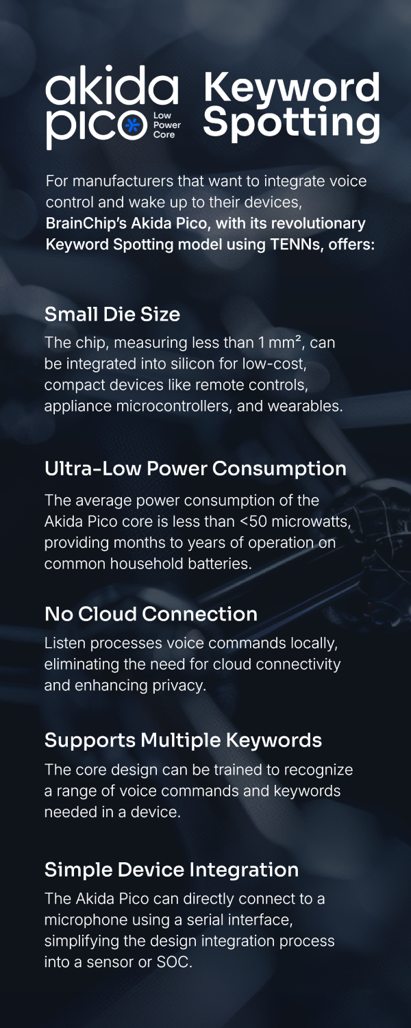 Akida Pico, leveraging advanced TENNs state-space neural processing models at the edge, transforms products with an ultra-low-power, private, and easy-to-integrate design for natural voice control. This marks the starting point for the future of voice interaction.